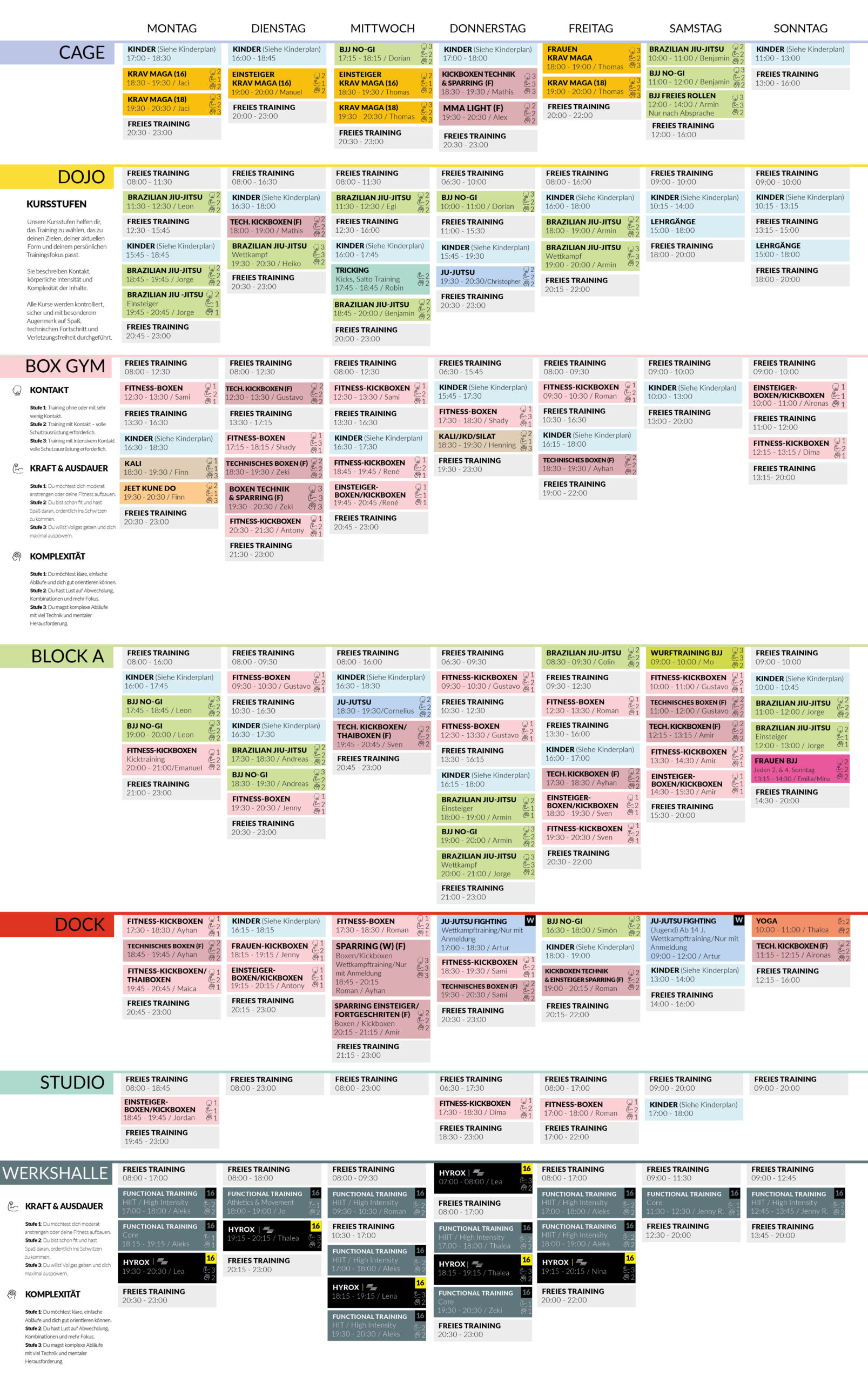Der Stern bedeutet, dass der Einstieg ohne Vorkenntnisse jederzeit möglich ist. Das F bedeutet, dass sich dieser Kurs nur für Fortgeschrittene eignet und die Teilnahme mit dem Trainer abgesprochen wird. Solltest du an einer der Fortgeschrittenen Einheiten teilnehmen wollen, sprich unsere Trainer deshalb gerne an. Alle anderen Kurse ohne Kennzeichnung sind offen für alle.